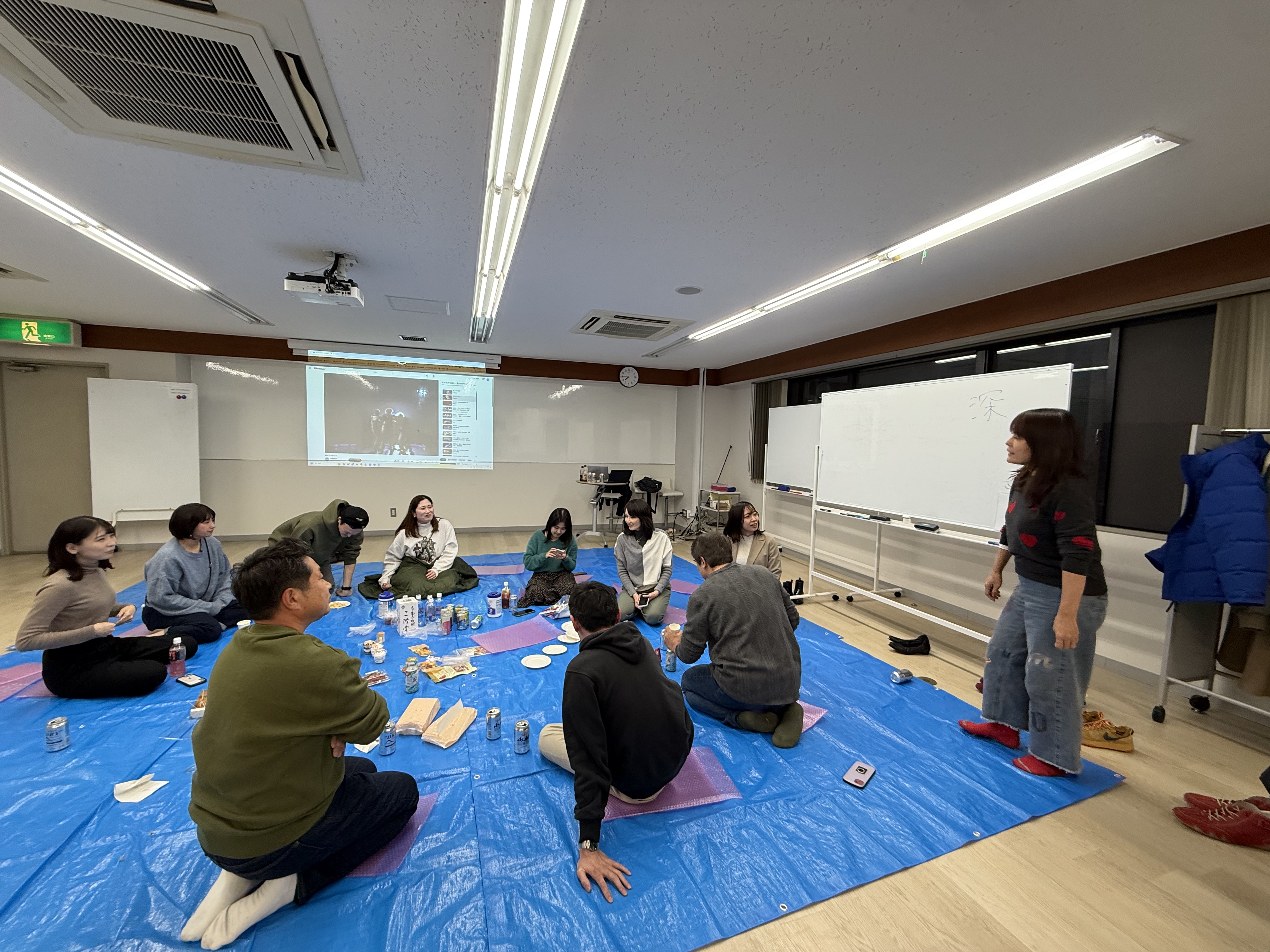 二次会はなんとパフ社内にある職サークルセミナールームでブルーシートの上でという「つきしま村塾」形式。(パフではそう呼んでいます)