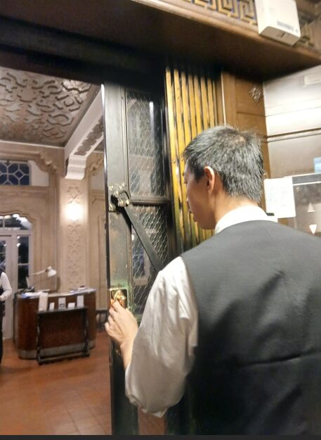 関西に住まう人であれば「よく天気予報の背景とかになっているあのお店ね」というおなじみの建物で、四条の鴨川沿いという好立地にある歴史と伝統のある中華料理店なのだそうです。私の最大の楽しみは日本最古のエレベーターに乗ることで、某ビル設備の企業様のプレゼンテーションで「昔はエレベーターに運転手がいた」というくだりが印象的だったのですが、実際に運転手が動かすエレベーターに乗ることが出来ました!由来は1924年米国で製造、輸入されたOTIS製とのことです。