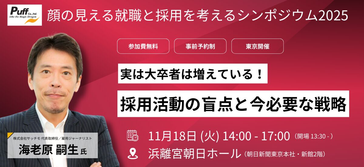 今回は、雇用ジャーナリスト・海老原嗣生氏をゲスト講師にお呼びし、「大卒者は増えているのに、なぜ採用できないのか?」という、多くの企業が抱える採用の核心的な課題に迫ります。 本シンポジウムを通じ、採用の"常識"を問い直し、貴社の未来を支える人材戦略の新たな視点を得るきっかけになれば幸いです。